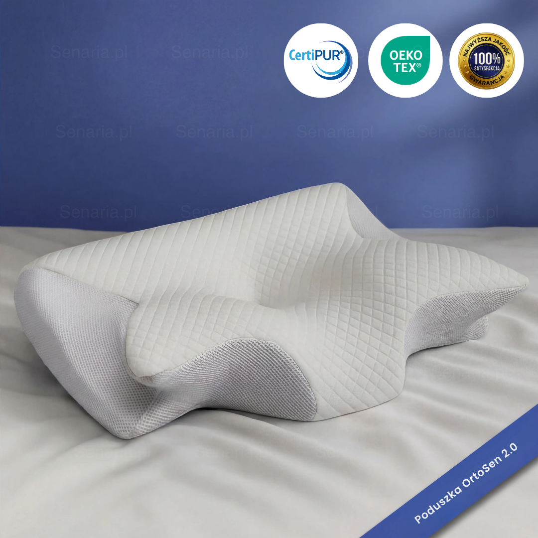 Poduszka ortopedyczna OrtoSen 2.0 zmniejsza ból szyi, barków i pleców, poprawia ułożenie kręgosłupa i wspiera regenerujący sen dzięki ergonomicznemu profilowi i piance pamięciowej. Idealna dla osób cierpiących na napięcia karku i trudności ze snem.